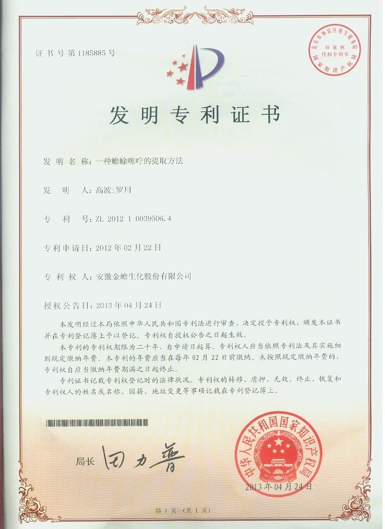 安徽华润金蟾药业股份有限公司申请的“一种蟾蜍噻咛的提取方法”发明专利,近日获得了国家知识产权局的专利证书,专利号:ZL201210039506.4。此项专利是华润金蟾在产品深度研发和知识产权保护方面取得的又一项重大成果。