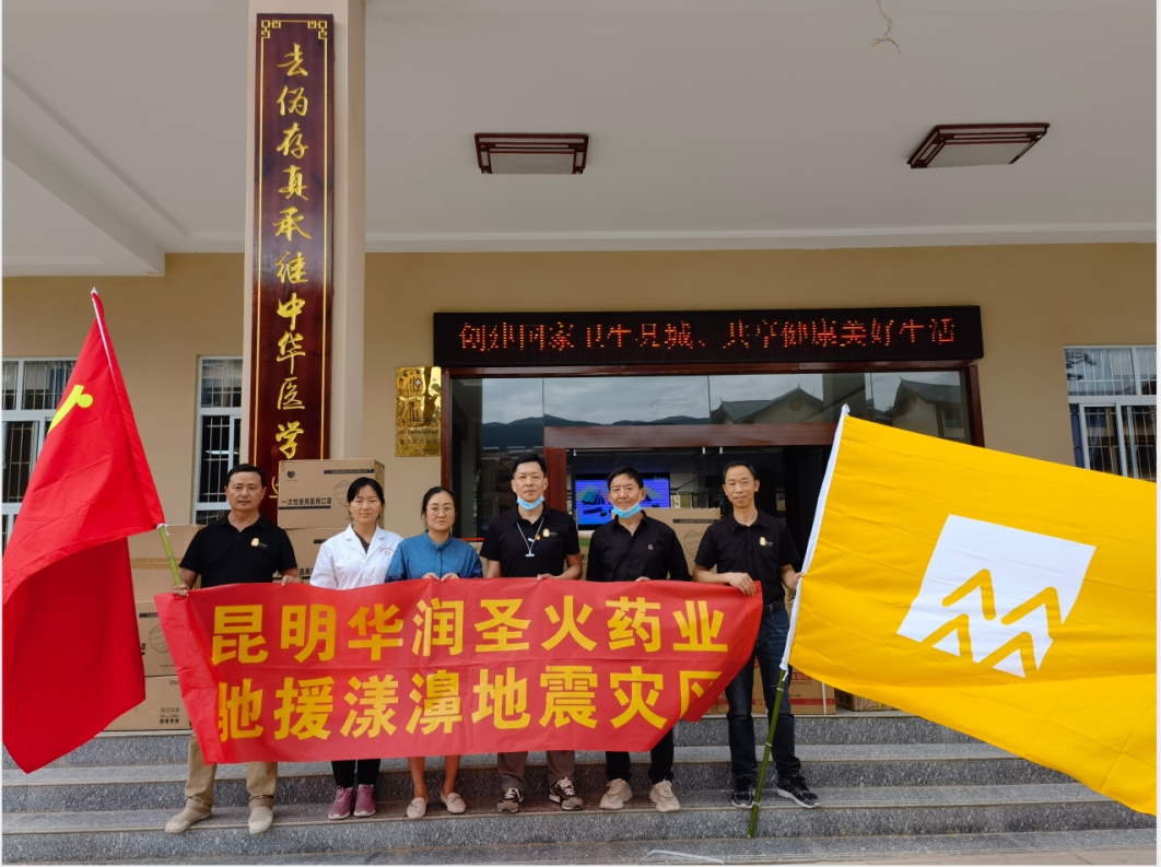 22日,华润圣火药业筹集并采购到灾区急需的感冒药、肠胃药、皮肤药等常用药品,消杀用品,口罩等物资,共计价值10.1万元,并于23日送抵云南省大理州漾濞县中医医院。