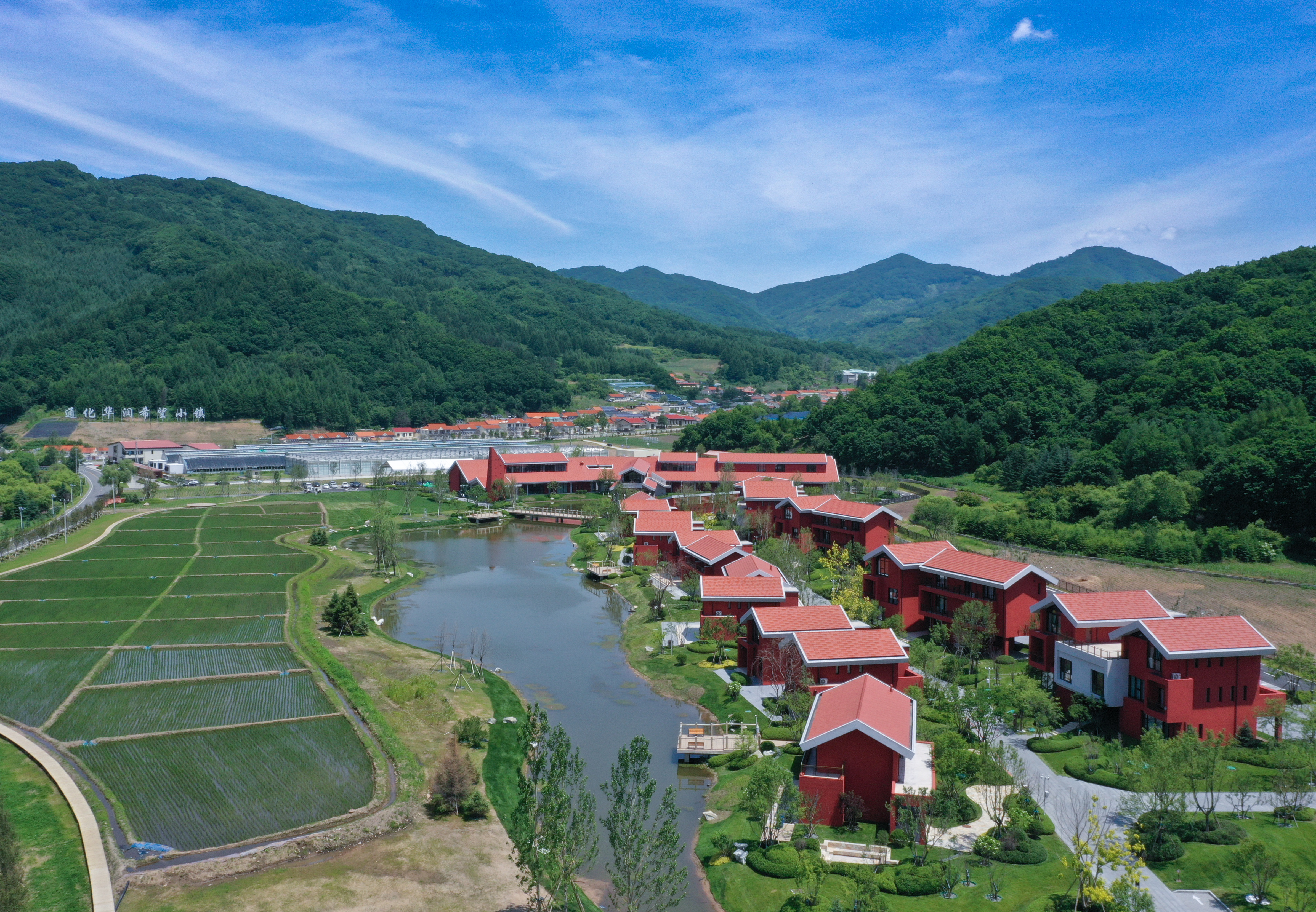通化华润希望小镇位于吉林省通化市东昌区金厂镇龙头村新立三组,是华润集团在全国范围内捐建的第十四座(东北首座)希望小镇。小镇规划用地37公顷,改建61户民居,新建精品酒店、综合服务中心、村民服务中心、市集长廊等公建配套,惠及1172户3973人。