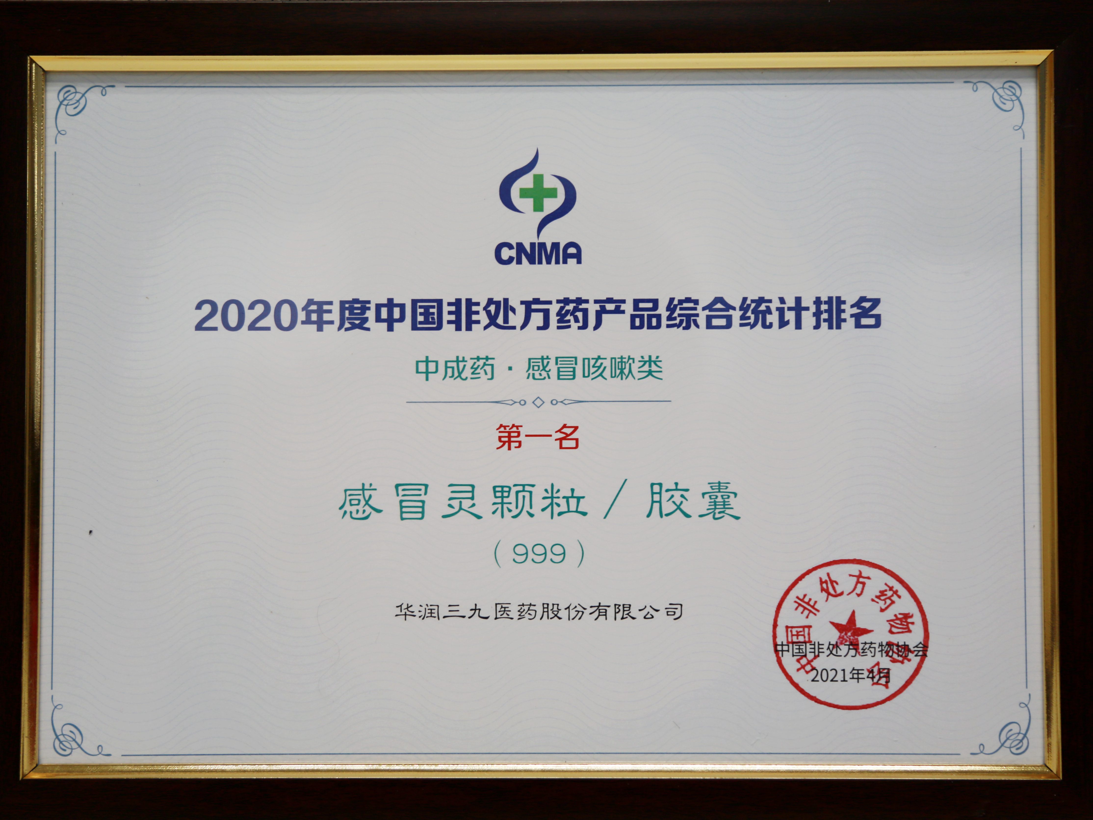 再次荣登榜首。此外,999感冒灵颗粒/胶囊连续九年蝉联感冒咳嗽类(中成药)第一名,999复方醋酸地塞米松乳膏、多烯磷脂酰胆碱胶囊(易善复)、999复方感冒灵颗粒在各自的品类排名中斩获前三甲。