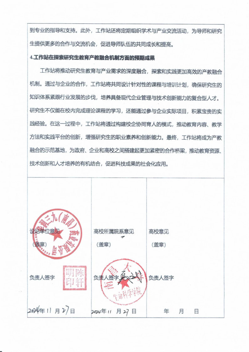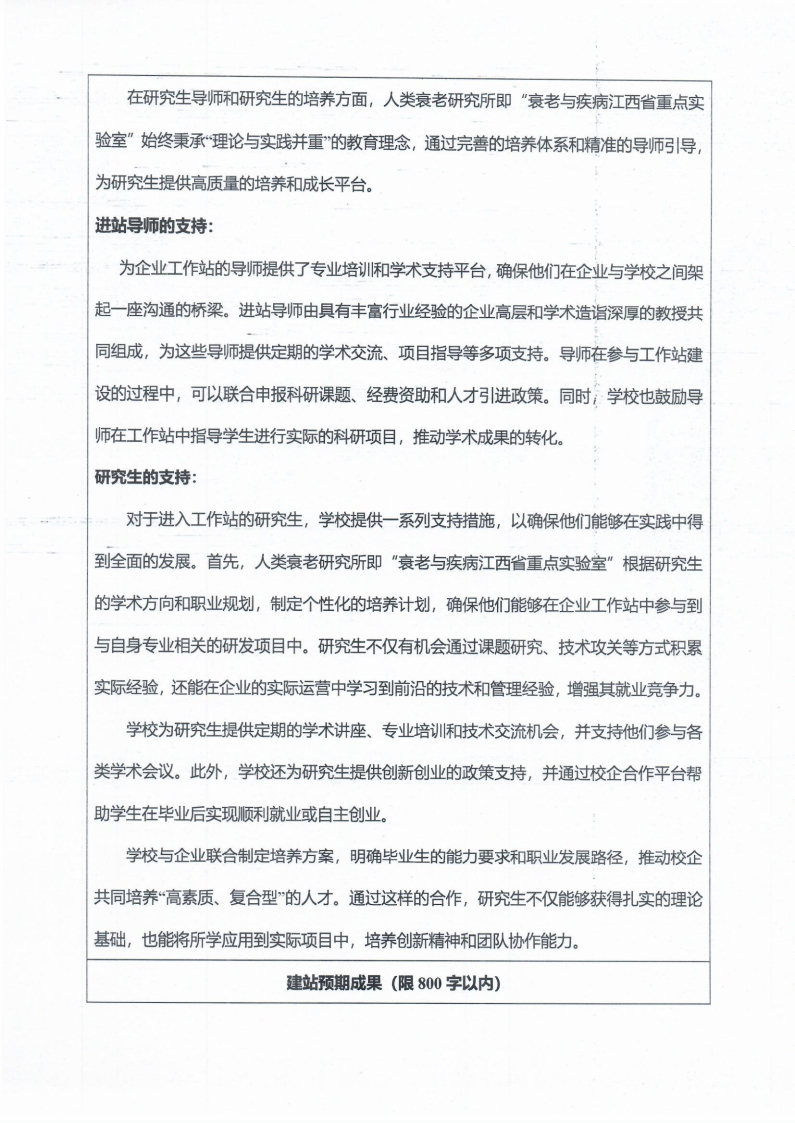 根据南昌大学研究生院的材料审查结果及专家评审意见,经研究决定,拟认定我单位与南昌大学生命科学学院人类衰老研究所“衰老与疾病”江西省重点实验室联合申报设立“首批南昌大学研究生工作站”,并推荐申报2024年江西省研究生工作站。 为确保公开透明,现根据相关规定,我单位对该项目的申报材料(见附件)进行公示,公示期为:2024年12月2日至12月6日。在此期间,欢迎社会各界提出宝贵意见和建议。如有异议,请于公示期内通过以下方式向我单位反馈。联系电话:18879135385 邮箱地址:[email protected] 。