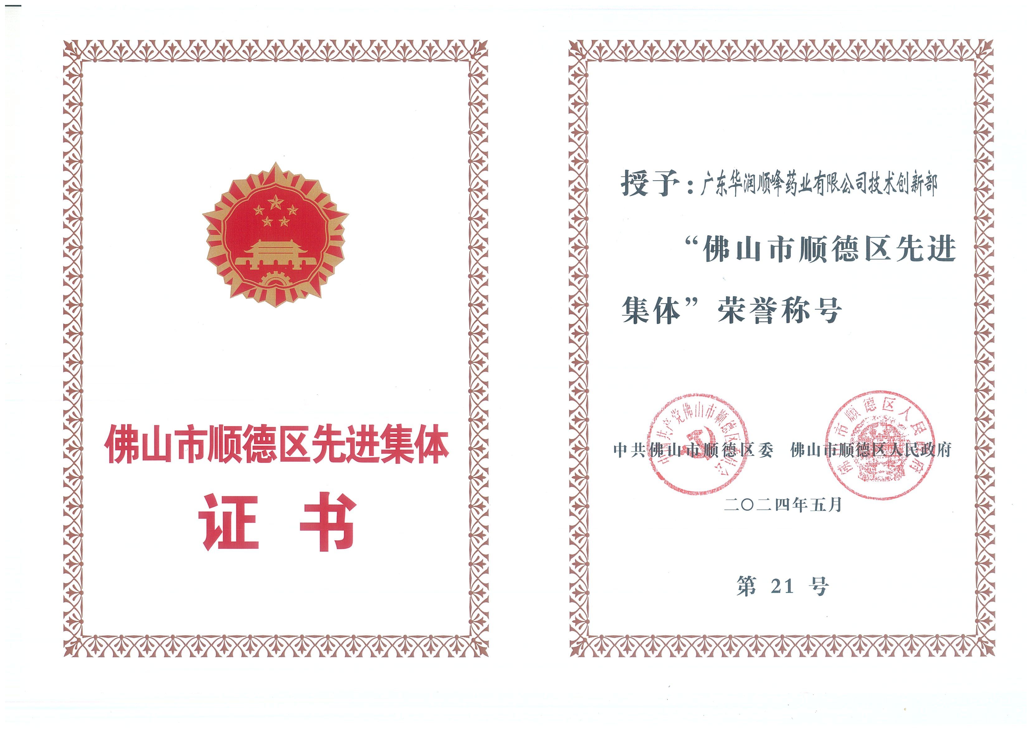华润顺峰技术创新部荣获佛山市顺德区先进集体荣誉称号