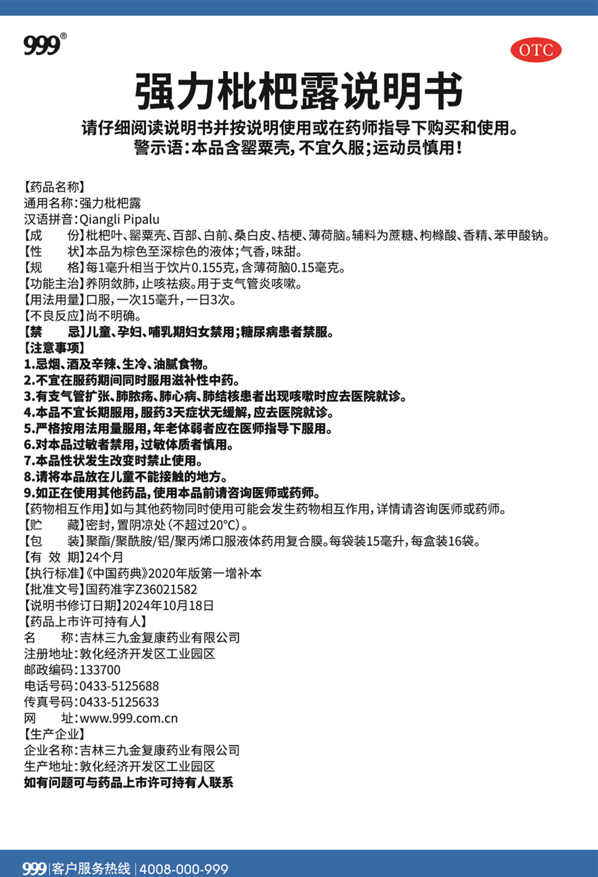 强力枇杷露说明书 请仔细阅读说明书并按说明使用或在药师指导下购买和使用。 警示语:本品含罂粟壳,不宜久服;运动员慎用! 【药品名称】 通用名称:强力枇杷露 汉语拼音:Qiangli Pipalu