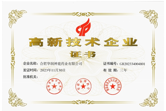 2024年1月18日,合肥华润神鹿药业有限公司获安徽省科技厅、财政厅和税务局颁发的高新技术企业证书,标志着华润神鹿顺利通过“高新技术企业”重新认定。按照《高新技术企业认定管理办法》(国科发火[2016]32号)要求,高新技术企业认定每三年重新认定一次,2023年是华润神鹿第六次开展高新技术企业认定。自2008年至今,已连续15年认定为高新技术企业,标志华润神鹿科技组织管理水平、科研成果转化能力、自主研发生产的产品得到国家科技部门的充分认可。下一步,华润神鹿将进一步加大科技创新投入,加强科技创新人才队伍建设,加速科技创新成果转化,不断提升科技创新活力与能力,持续推动企业高质量发展。